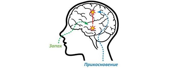 По центростремительному нерву от рецепторов носа в мозг поступает информация о запахе, и определенный участок мозга приходит в возбужденное состояние. По центростремительному нерву от кожных рецепторов поступает информация о прикосновениях и еще один участок мозга приходит в возбужденное состояние. А поскольку происходит это одновременно, то между этими очагами возникает связь — ассоциация. Возникает ассоциация между приятными ласками и безразличными — пока — запахами алкоголя.