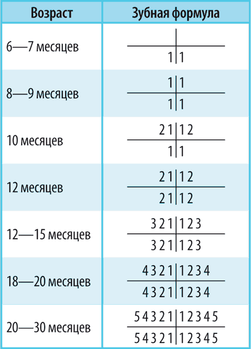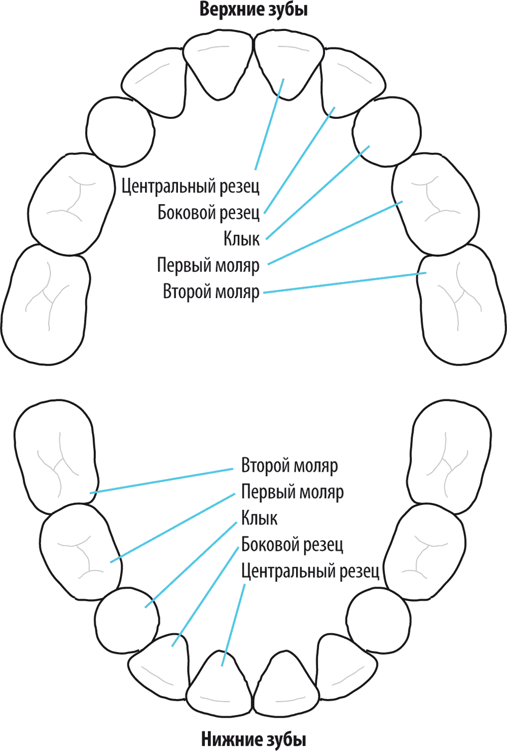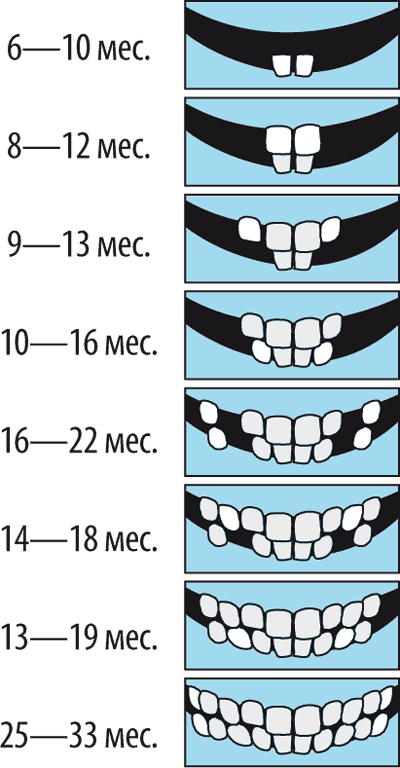 Из таблицы видно, что молочные зубы режутся в определенном порядке: 2 нижних резца – 2 верхних резца – 2 верхних и 2 нижних боковых резца; первые коренные зубы – около 12–13 месяцев, клыки – 17–19 месяцев, вторые коренные зубы – 21–24 месяца. У большинства двухлетних детей имеется 20 молочных зубов.