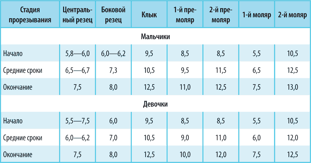 Таблица показывает, что существует примерная последовательность нормального прорезывания постоянных зубов: