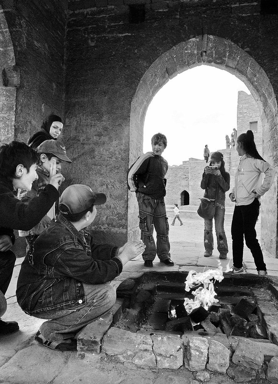 К двум достопримечательностям нас все же свозили, московско-бакинский друг, который и организовал это путешествие. Одна – храм огнепоклонников, построенный индусами, но давно переделанный, тут выставлена запись: «число поклоняющихся в храме в разные периоды его истории – 1848 г. 5 чел. Журнал «Русский инвалид», 1856 г. 3 чел. А. Писемский, 1860 3 чел. Географическо-статистический словарь, 1862 1 чел. Д. Менделеев». Надо ли объяснять, какая земля породила периодическую таблицу! Другая достопримечательность – это та же горящая земля без всякого храма. Горит так называемый попутный газ, который образует слой между поверхностью земли и нефтью. Посмотрели мы на пламя, рвущееся из канавы, и подумали: если уж показывать, то хоть территорию как-то окультурить, кафешку открыть, сувениры продавать. Ну что-нибудь сделать. С этим в Азербайджане проблема. Как, впрочем, и в России. Все, что дальше центра Баку – пустыри, помойка, свалка, запустение. Пейзаж, правда, другой: повсюду на преимущественно голой и сухой земле – нефтяные вышки.