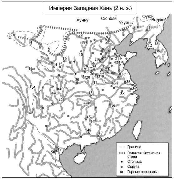 1 — Чанъань; 2 — перевал Юймынь; 3 — Дуньхуан; 4 — Цзюцюань; 5 – Чжанье; 6 — Увэй; 7 – Шофан; 8 — Уюань; 9 — Шангу; 10 – Ляодун; 11 — Сюаньту; 12 — Лэлан; 13 — Линьдунь; 14 — Луней; 15 – Тяныпуй; 16 — Аньдин; 17 — Бэйди; 18 — Шан; 19 — Сихэ; 20 – Ханьдань; 21 — Линьцзы; 22 — Тайшань; 23 — Динтао; 24 — Чэньлю; 25 — Хэнэй; 26 — Хэнань (Лоян); 27 — перевал Ханьгу; 28 — Хэдун; 29 — перевал У; 30 — Ханьчжоу; 31 — Наньин; 32 — Инчуань; 33 – Жунань; 34 — Цзючжан; 35 — Гуанлин; 36 — Гуйцзи; 37 — Пэнчэн; 38 — Даньян; 39 — Юйчжан (Наньчан); 40 — Гуанхань; 41 — Шу (Чэнду); 42 — Ба; 43 — Нань (Цзянлин); 44 — Улин; 45 — Линлин; 46 – Гуйян; 47 — Наньхай; 48 — Цану; 49 — Цзяочжи; 50 – Цзючжэнь