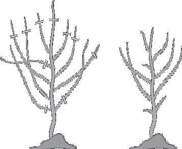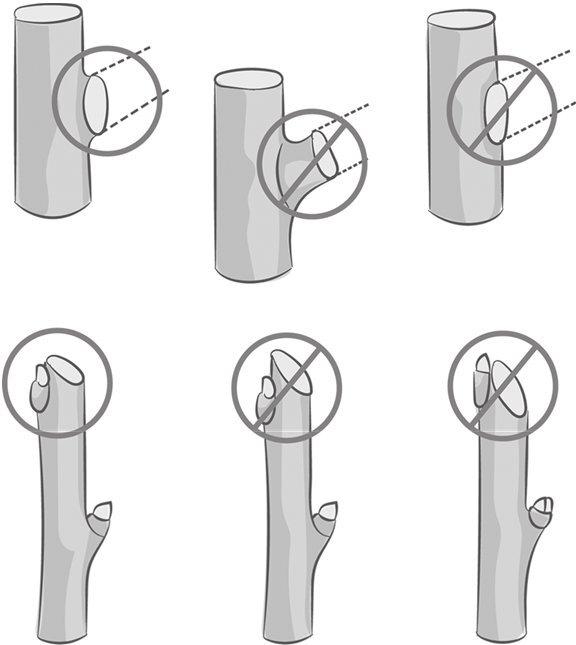 Для формирования кроны ветви обрезают на почку. При обрезке на почку правильный срез делается под углом примерно 45 градусов. Срез должен находиться буквально на 4–5 мм выше почки, но отступать слишком высоко тоже не следует (см. рис. «Правильная обрезка на кольцо и на почку»).