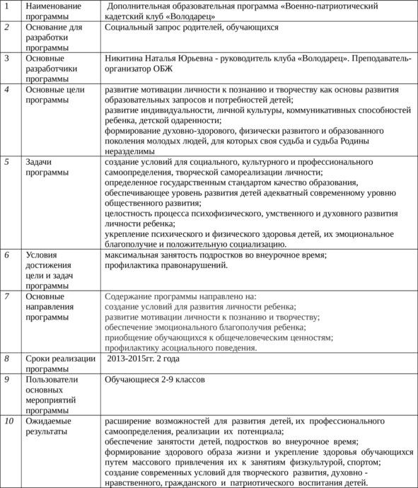 — авторской программы Никитиной Н. Ю. «Программа организации, развития и работы кадетских классов (в условиях городской общеобразовательной школы) «Во славу России» (Рецензент В. Н. Некрасов- старший преподаватель кафедры ФК и БЖ УИПКПРО, 2009г.);