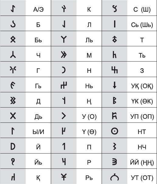 Ниже приведена таблица знаков древнетюркского рунического алфавита и их соответствия знакам современной кириллицы.