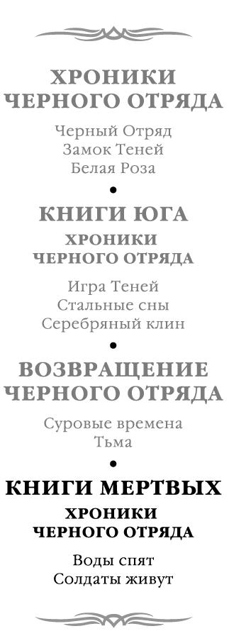 Книги надо писать. Истина должна быть увековечена, даже если судьба распорядится так, что ни один человек не прочтет начертанных мною слов. Анналы — душа Черного Отряда. Они напоминают о том, кто мы есть. И кем были. О том, что мы продолжаем существовать. И что никакое вероломство — а мы не в первый раз сталкиваемся с ним — не высосет из нас всей крови до последней капли.