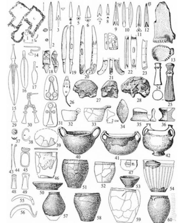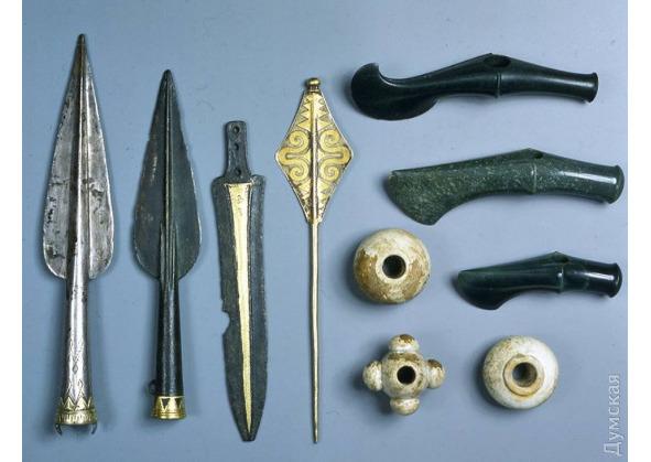 Прокрутим хронологический калейдоскоп на полтора десятка тысячелетий, поскольку подробней о памятниках мезолита и неолита я уже писал во 2 томе трилогии «Легенды древнего края». Остановлюсь на значительных памятниках Одесщины периода Энеолита– медно-каменного века. Время, между 3500 и 3000 годами до новой эры, на территории Бессарабии, Румынии и Молдовы расцветала Усатовская культура. Её считают гибридной, сочетающей черты как земледельческой позднетрипольской, так и пришедшей ей на смену полукочевой ямной. «Генетической основой явились трипольские племена, взаимодействовавшие с иноэтническими группами — носителями майкопского культурного субстрата и древнеямной культуры или сформировавшие новое этническое образование с ярко выраженными степными элементами», — отмечается в одной из работ, посвященных усатовцам. Памятники этой культуры обнаружили в 1921 году в одесском пригороде — селе Усатово, отсюда и название. Первооткрыватель — одесский археолог Михаил Болтенко. «Среди грубых черепков битой посуды вперемешку с раздробленными костями животных пестрят и белеют, играя на солнце перламутровым блеском, ракушки съедобных моллюсков», — так описывал ученый первое впечатление от увиденного. На берегу Хаджибейского лимана было раскопано 18 курганов каменными плитами — кромлехами, два бескурганных могильника и поселение — на Шкодовой горе. Также, в Маяках обнаружено поселение, с оборонительным рвом, и могильником. Археологи нашли в погребениях медные кинжалы, топоры, шила, глиняную посуду, в поселении — изделия из кремня (ножи, проколки, острия), каменные зернотерки, ткацкие пряслица, глиняные культовые изделия, фигурки женщин и животных, обломки керамики с орнаментом, грузила и костяные рыбацкие крючки. Предположительно, усатовцы были более оседлыми скотоводами и рыболовами, но не земледельцами. В конце III тысячелетия до н.э. их ассимилировали, представители ямной общности, которые продвигались с востока на северо-запад Причерноморья. Ямников принято считать первыми индоевропейцами. На территории самой Одессы усатовцы и ямники не жили. Береговая линия тогда, была другой. На месте Одессы, земля была с многочисленными оврагами и балками, с заросшими колючками склонами. Селиться на обрывистых склонах было неудобно. Причина освоить эту территорию появилась во втором тысячелетии до Рождества Христова, в самом конце бронзового века. Сабатиновцы были искусными литейщиками. Они делали из оловянистой бронзы разнообразные орудия — от сельскохозяйственного инвентаря до мечей и копий. Некоторые археологи относят их к протофракийцам.
