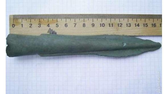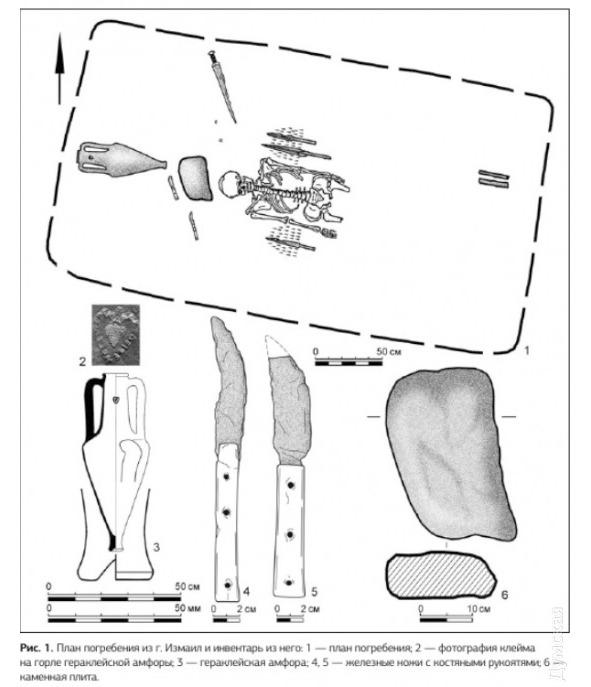 Погребенный лежал, на спине, головой на северо-запад. Под скелетом нашли остатки подстилки из коры. Рядом с умершим лежал богатый арсенал: два колчана с остатками стрел — наконечниками (120 штук), три копья и железный меч-акинак. За головой погребенного — каменная плита, рядом два железных ножа с костяными ручками. Там же нашли амфору из Гераклеи Понтийской (древнегреческой колонии на южном берегу Черного моря), с клеймом (виноградная гроздь и имена мастера-фабриканта Носса и магистрата Каракюда, который правил Гераклеей в 60-х годах IV века до нашей эры. Этим периодом и принято датировать погребение в Измаиле. Более подробно о прочих находках, смотри том 2 трилогии «Легенды древнего края».