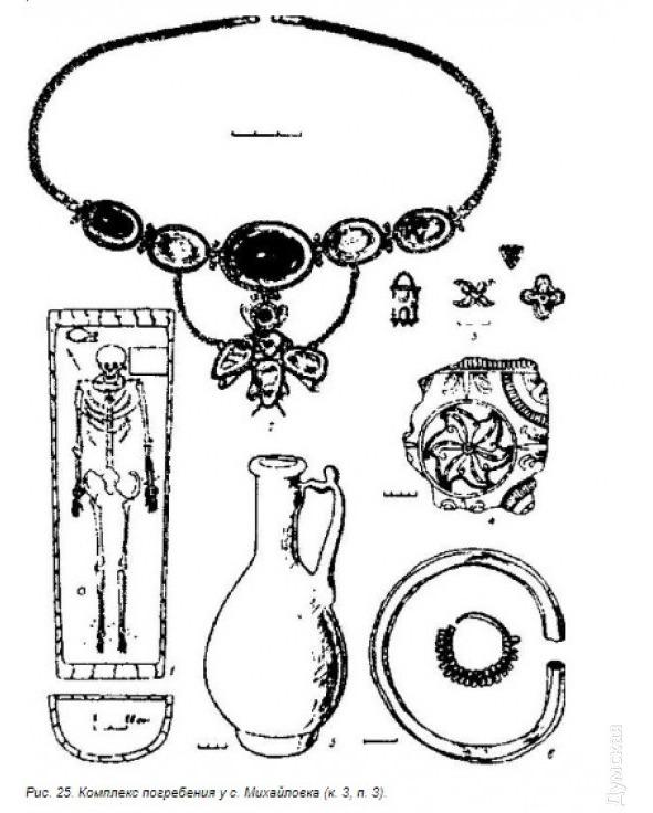 Сарматская жрица. В 1982 году, одесские ученые И. Черняков, А. Дзиговский, А. Добролюбский и И. Сапожников, работая в составе Буго-Днестровской экспедиции Института археологии АН УССР, обнаружили у села Михайловка, Саратского района богатое захоронение — с золотоыми и серебряными предметами. Захоронение сарматское (ираноязычные кочевники, сменившие скифов в причерноморских степях). Погребение — «впускное»в курган эпохи энеолита. Над ним — мощная грунтовая подушку, с остатками тризны — осколками амфор и обломками костей животных. Молодая женщина была погребена в деревянной колоде, вместе с богатым и разнообразным инвентарем, среди которого выделяются золотые браслеты, бронзовый перстень со стеклянной вставкой-печатью, серебряная серьга, золотое ожерелье с сердоликовыми вставками и подвеской в форме пчелы или бабочки, стеклянный кувшин и бронзовое зеркало в деревянном футляре с растительным орнаментом. Бронзовые зеркала такого типа получили распространение в I веке нашей эры, причем чаще всего их находят на территории Италии. Непосредственно обнаружил сарматку профессор Андрей Добролюбский: «Воткнул лопату в землю, и… со слов в его книге «Одессея одного археолога: «Все-таки, профессионализм археолога — это инстинкт движения. Лопата ударилась обо что-то твердое. Вернее, как бы это правильно сказать, она только начинала ударяться, понимаешь? Опыт и интуиция — вещи великие в нашем деле. Я взял лопату, потому что был уверен, что деревяшка оказалась здесь случайно, и внизу ничего нет. Решил проверить ее чисто механически и пойти дальше на траншею… У меня мгновенно оторвалась нога от заступа. Ударилась лопата об абсолютно целый кувшин синего стекла. Я его ухитрился даже не поцарапать своей лопатой — на нем не оказалось ни одной трещины»! Руководитель изысканий Черняков, положил самые ценные вещи в свой портфель и увез в Киев, в Академию наук, распорядившись дочищать оставшееся на месте.