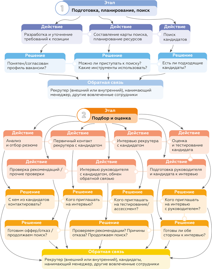 Технологию поиска и подбора персонала принято описывать в «шагах рекрутмента». В различных источниках вы встретите 17, 25, 30, 35 и более шагов. Однако для успеха важно не количество этапов, а их содержание и последовательность. Если четко соблюдать технологию, то обязательно получите результат. Если что-то идет не так, проанализируйте свои действия на каждом из этапов — и вы непременно обнаружите причину сбоя и найдете решение возникшей проблемы.