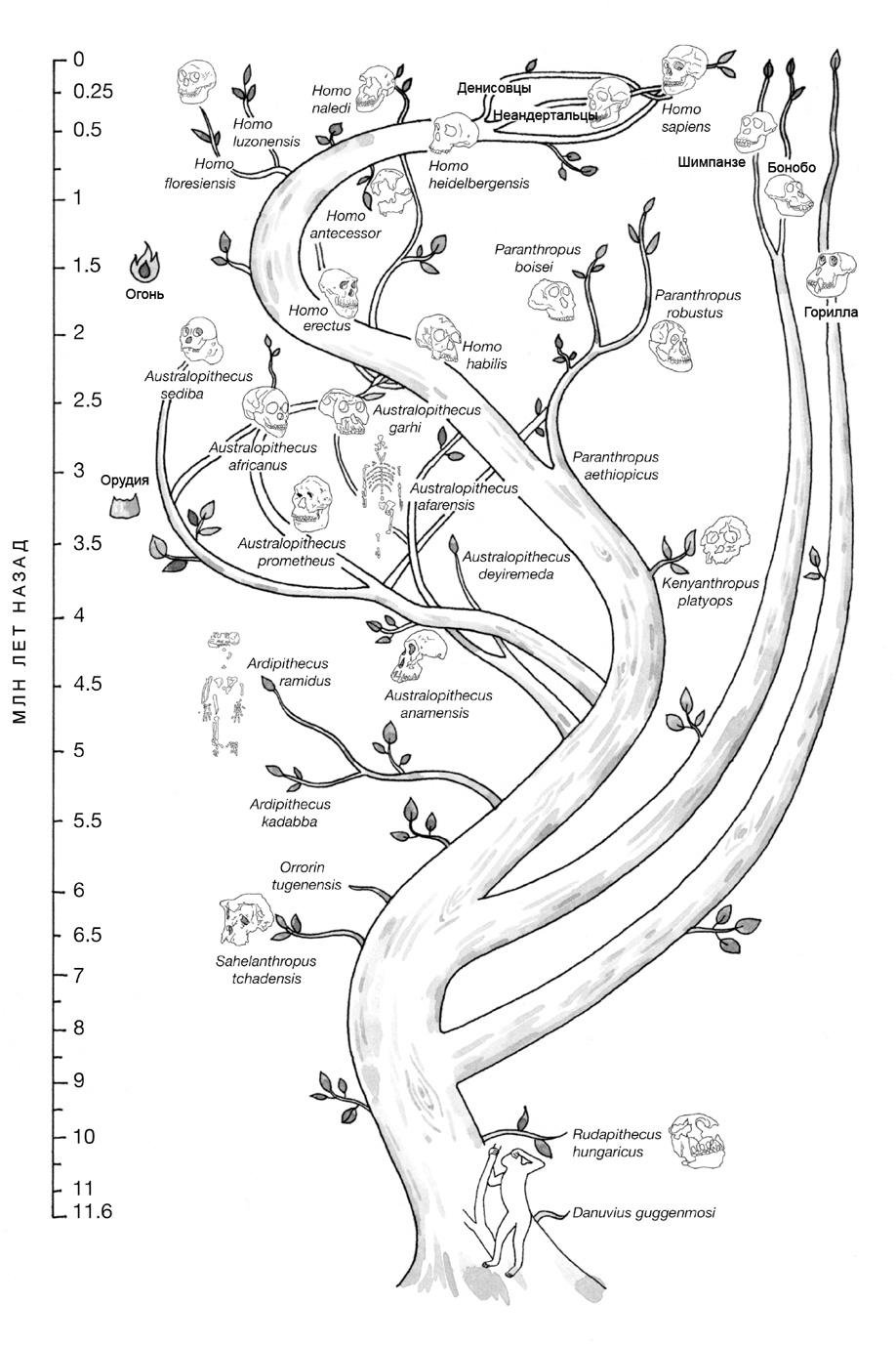 Палеонтологи обнаружили более 25 видов ископаемых предков человека и их вымерших родственников (гоминин) и присвоили им научные названия. На страницах этой книги вы встретитесь со многими из них — здесь они представлены по их названиям и характерным окаменелым остаткам. Хотя мы знаем, когда жили эти гоминины (см. рисунок ниже: по вертикальной оси — время в млн лет назад), остается неясным, насколько родственными друг другу были их виды. На этом древе изображены возможные связи, однако, судя по генетическим данным и недавно найденным окаменелостям, некоторые части генеалогического древа человека представляют собой сложное хитросплетение взаимосвязанных ветвей. Безусловно, дальнейшие открытия в чем-то еще больше усложнят эту картину, а в чем-то упростят.