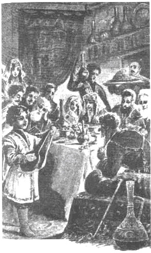 За обедом сидели и женщины, хотя по старому дедовскому обычаю грузинки должны сидеть отдельно от мужчин. Здесь же находилась и старая Илита, которую князь Павле считал скорее за родственницу, нежели за простую служанку, и ее внучка, проказница Шуша, то и дело прятавшая под чадрою (покрывало, которое носят на Кавказе девушки) свои плутовские глаза. Они занимали и угощали женское общество, приютившееся отдельно от мужского на дальнем конце стола.