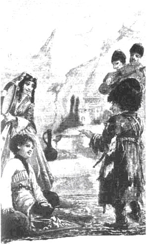 В ту же минуту с веселым смехом и шумом двое детей выскочили из-за зеленой засады и бросились к старухе. Впереди бежал мальчик лет девяти, тоненький, стройный, чернокудрый. Его красивое смуглое личико задорно выглядывало из-под невысокой бараньей шапочки, а синие яркие глазенки, казавшиеся еще темнее под густыми ресницами и черными, гордо вырисованными бровками, так и искрились, так и горели шаловливым огоньком. Одет он был в белый кафтан из тонкого сукна, который плотно облегал его гибкую фигуру, и в широкие малиновые шальвары (штаны); мягкие сафьяновые сапожки с кисточками вместе с серебряным поясом дополняли его наряд. На груди его сверкали блестящие патронники, а за поясом был заткнут маленький настоящий кинжал.