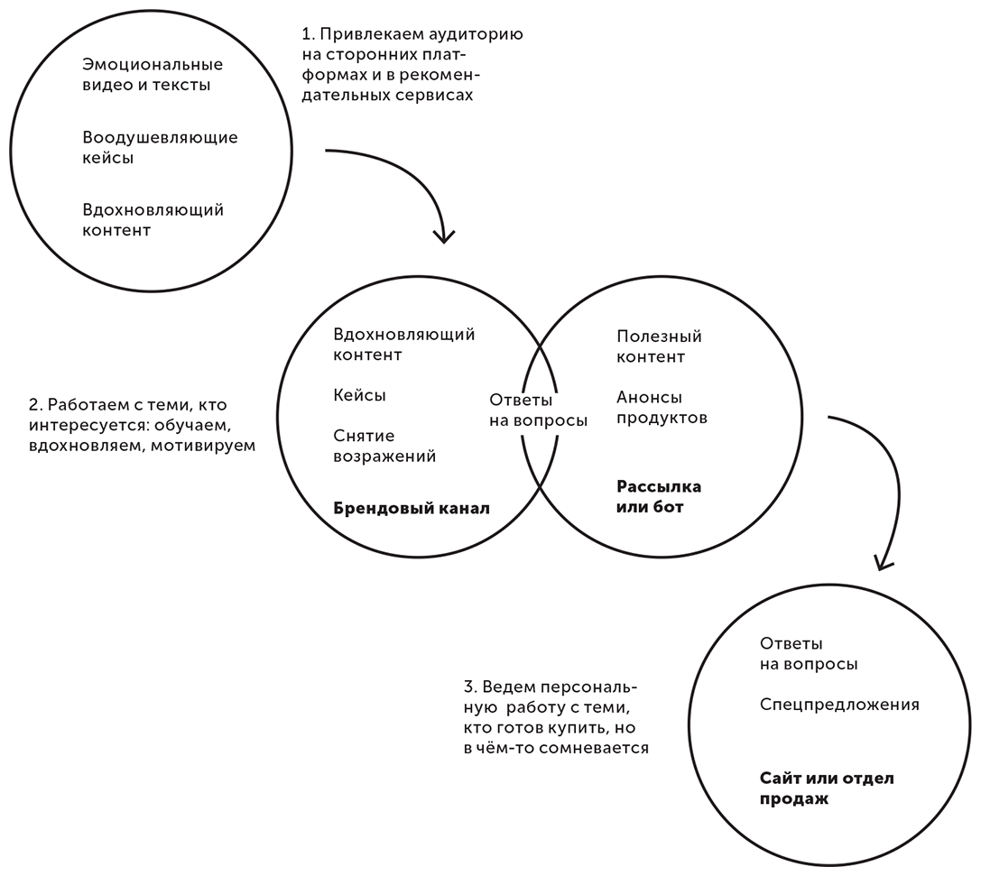 По этой схеме вы получите результат за два–четыре месяца: огромное число людей узнает о вашем продукте и начнет им интересоваться, возможно, даже подпишутся на вас, если вы дадите на это хороший повод. Именно продаж на этом этапе может не быть, но вы этим займетесь на следующих этапах воронки.