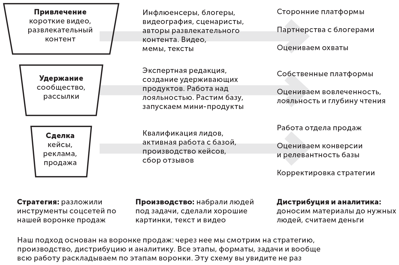 Дальше в книге будет большой разговор про стратегию: мы погрузимся в контент-маркетинг, соединим его с воронкой продаж, определимся со структурами больших редакций и изучим KPI в зависимости от этапов пользовательского пути; у нас будут стратегические этюды для легкого B2C и сурового энтерпрайзного B2B; для строителя и диетолога; для маленькой и большой компании. Всё это будет потом, и это будет сложно.