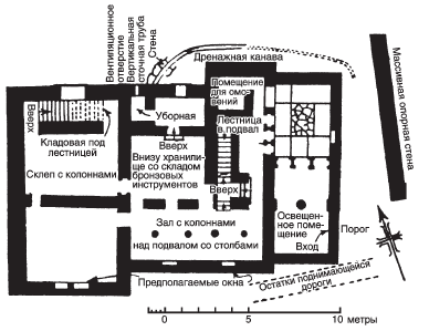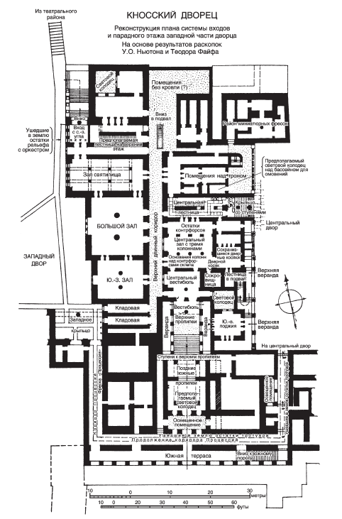 Главной особенностью дворца был открытый и просторный двор (рис. 7, а). На восточной стороне двора через вход с колоннами, вымощенный гипсовыми блоками, можно было попасть в вестибюль, а оттуда в парадный зал – мегарон, в котором крашеный оштукатуренный пол окаймлялся рядом гипсовых блоков. В центре мегарона четыре деревянные колонны, обитые с внутренней стороны бронзой, окружали приподнятый круглый очаг (ср. рис. 5, з). Стены зала украшали фрески, на которых изображались колесницы в бою, лошади с конюхами и женщины, гуляющие вне дворца. С западной стороны двора дверь вела в переднюю, отделявшую тронный зал от внушительной лестницы, которая вела ко входу для высокопоставленных посетителей. Жилые помещения дворца находились с северной стороны от двора и имели верхний этаж; вероятно, туда попадали из вестибюля мегарона. В жилых помещениях параллельно северной и южной стенам двора шли два длинных коридора. В северной, самой высокой части дворца находилось святилище с круглыми алтарями из раскрашенной штукатурки; рядом с ними была найдена скульптурная группа из двух богинь и ребенка, сделанная из слоновой кости. Плоская глиняная крыша дворца, укрепленная тростником и стропилами, держалась на горизонтальных балках. С крыши открывался вид на широкую равнину до самого Арголидского залива, а в другую сторону – на горы Аркадии и Лаконии.