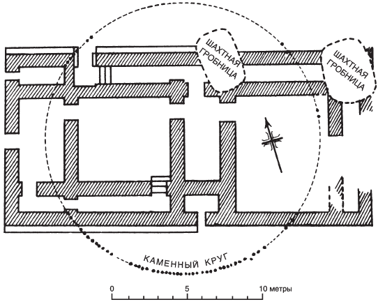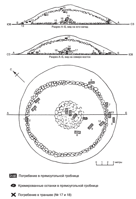 Мы уже упоминали святилище в Лерне в виде низкого кургана, имевшего 19 м в диаметре и окаймленного камнями, появившееся в начале 3-го РЭ после жестокого разрушения поселения пришельцами. Единственный более ранний случай такой практики известен по «царским могилам» 2-го РЭ на Левкасе, которые расположены в небольших курганах от 2,7 до 9,6 м в диаметре, насыпанных поверх каменных помостов. Но в среднебронзовый век аналогичные курганы появляются во многих местах Греции. Семейные могилы на Левкасе находятся в круглых курганах; один из них достигает 12,1 м в диаметре, окружен каменной стеной и содержит одиннадцать выложенных камнем прямоугольных гробниц и две погребальные ямы. В курганах, как и в «царских могилах», найдены керамика, украшения и оружие для умерших. Курганы среднеэлладской эпохи были раскопаны в Мальти и других местах в западной Мессении и Ахее, но мертвых в них обычно хоронили в сосудах (пифосах), а погребальных даров не было найдено. В восточной части Греции раскопаны два больших кургана СЭ; тот, что в Элатее (Фокида), содержал ценные подношения, а тот, что в Афидне (Аттика), – нет. Датировка и расположение этих курганов указывают на северо-западные области и свидетельствуют о морских связях вдоль западного побережья, и действительно, недавно в северном Эпире и Албании было обнаружено много таких курганов. Отчеты об их раскопках остались практически незамеченными. Больше всего курганов находится в долине реки Мати, где в наше время (1952–1960) было раскопано 35 курганов; они имеют от 12 до 30 м в диаметре, в высоту достигают 3 м, иногда окружены кольцом камней. В погребениях встречается много предметов; использовались и предание земле, и кремация. Большая часть предметов принадлежит раннежелезному веку, но попадается и оружие СЭ типа. Далее к югу на реке Деволи под Эльбасаном находятся 25 курганов до 5 м высотой и до 45 м в диаметре. Центральные погребения в этих курганах содержат много оружия и даров СЭ эпохи, а в других частях курганов найдены оружие и керамика ПЭ эпохи. В Вайзе у Орикского залива были раскопаны 4 кургана 18–20 м в диаметре и 2,3 м в высоту, и в одном из них на каменной пирамиде, где проводилась кремация, обнаружены оружие СЭ и СМ типов и СЭ керамика. В долине верхнего Дрина во внутреннем Эпире курганы раскопаны в Какави, Бодриште и Водине. Один из курганов в последнем месте имеет 17 м в диаметре и более 3 м в высоту; в нем рядом с центральными погребениями, связанными с каменной пирамидой, найдены оружие СЭ и СМ эпох и СЭ керамика. Кроме центральной пирамиды, обнаружено кольцо камней у периферии кургана и галечный купол чуть ниже нынешней вершины кургана (см. рис. на с. 52). Другие погребения принадлежат к ПЭ периоду.