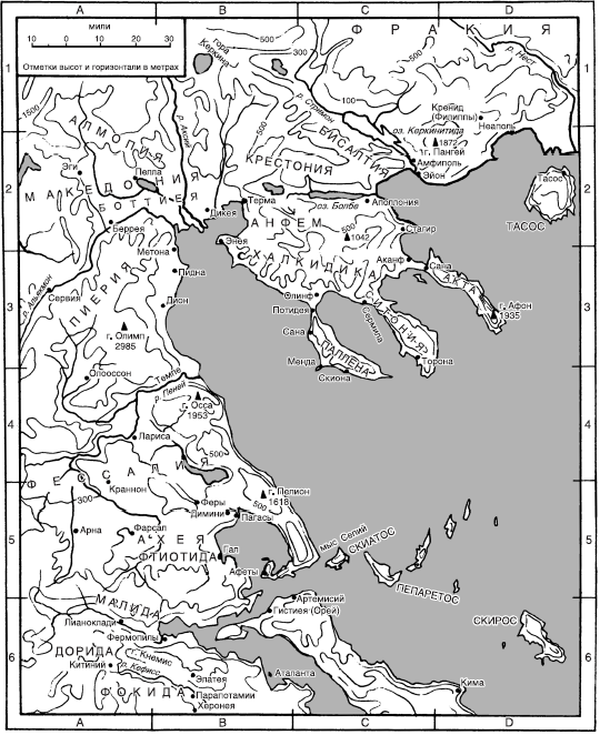 Проход в центральную Грецию преграждают хребты Эта и Кнемис. Самый легкий путь проходит по побережью через узкие «ворота» Фермопил и продолжается через Локриду, узкую холмистую полосу с плодородными равнинами в Тронии и Опусе, выходящими к Эвбейскому проливу. Внутренний путь ведет к высокому отрогу Эты и выходит на небольшое плато Дориды, где лежат истоки Кефисса. От этого голого, сурового плато на юг ведут два пути: один через Амфиссу к Коринфскому заливу, а второй по долине Кефисса в Фокиду. Ландшафт Фокиды определяется горным массивом Парнас, поднимающимся над узкой долиной Амфиссы на западе и протяженной плодородной долиной Кефисса на востоке. Его более высокие склоны поросли хвойными лесами и пригодны для летних пастбищ, но предгорья пустынные или покрыты колючим кустарником. Южная сторона Парнаса отвесными утесами возвышается над тянущимся с запада на восток ущельем, по которому проходит путь из Левадии к Коринфскому заливу. На северной стороне ущелья у подножия утесов находятся священные Дельфы, контролирующие западный участок пути, который здесь спускается через обширные оливковые рощи Крисы к Итее. Между ущельем и заливом простирается область изрезанных, труднодоступных известняковых гор. Самая богатая часть Фокиды – обильно орошаемая долина Кефисса с плодородными землями и хорошими пастбищами; ее города расположены на самых крайних отрогах Парнаса.