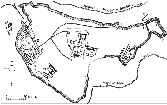 а) Микенская цитадель A. Львиные ворота; B. Доисторическое кладбище за стенами; C. Зернохранилище; D. Могильный круг A.; E. Пандус; F. Дом вазы с воином; G. Дом с пандусом; H. Южный дом; J. Эллинистические помещения; K. Дом Цунтаса; L. Дворец; M. Фундаменты храмов; N. Дом с колоннами; O. Первоначальная северо-восточная стена; P. Потайной выход; Q. Сток; R. Эллинистический резервуар; S. Потайной резервуар; T. Задняя решетка; U. Микенская террасная стена