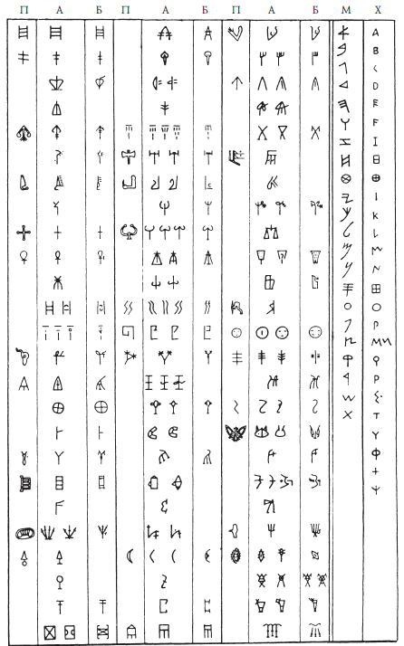 Рис. 8. Некоторые знаки минойского пиктографического письма (П), минойского письма (А) и микенского письма (Б), иллюстрирующие центральную роль минойского письма в развитии письменности. Моавский и халкидийский алфавиты (М и Х) произошли от финикийского алфавита