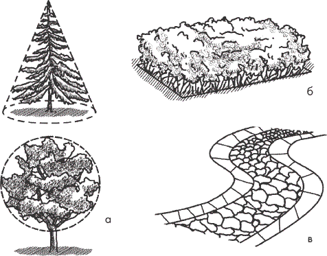 Рис. 3. Разновидности формы в ландшафтной архитектуре: а – объемная; б – плоскостная; в – линейная