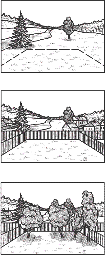 Применение законов перспективы позволяет создавать иллюзию углубления или сокращения пространства. Например, для того, чтобы визуально увеличить глубину садового пространства, можно прибегнуть к приему создания промежуточных планов, так называемых кулис, где растения ориентируют взгляд на горизонт. Противоположную задачу решит включение в пространство сада окружающей природы, скажем если устроить кулисы из деревьев и высадить вдоль забора вьющийся кустарник (рис. 4).