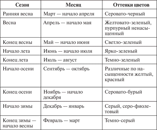 Таблица 2. Смена колорита сада в период с ранней весны до поздней осени