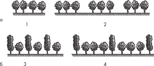 Рис. 5. Варианты ритмических чередований деревьев: а – простой ритмический ряд одинаковых форм; б – ритмическое чередование двух разных форм; 1 – простой линейный ряд; 2 – чередующийся ряд из трех одинаковых форм; 3 – простой чередующийся ряд; 4 – чередующийся ряд одного колонновидного с тремя шарообразными