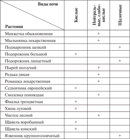 Рассказать о составе и иных особенностях грунта способны характерные для данной местности растения: полевая мята и львиный зев произрастают на тяжелых почвах; мать-и-мачеха – на глинистых; вероника колосковая, коровяк – на известковых; лебеда, камыш – на соленых; смолевка, вероника трилистная – на песчаных; кипрей, калужница – на влажных; тимьян, щавель мелкий – на сухих. (Более подробно о том, какие почвы предпочитают определенные растения, мы расскажем далее.)