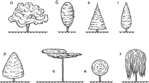 Рис. 1. Кроны деревьев: а – раскидистая; б – овальная; в – пирамидальная конусовидная; г – пирамидальная веретенообразная; д – яйцевидная; е – стелющаяся; ж – шаровидная; з – плакучая