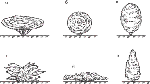 Рис. 2. Кроны кустарников: а – продольно-овальная; б – шаровидная; в – овальная; г – раскидистая; д – стелющаяся; е – конусовидная