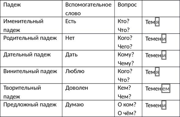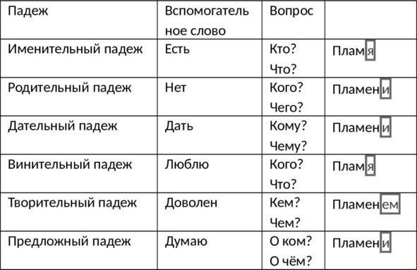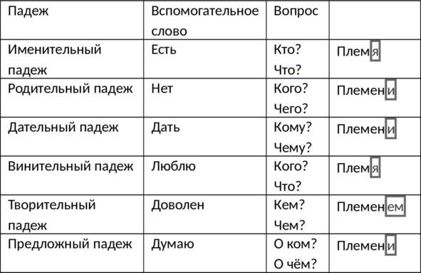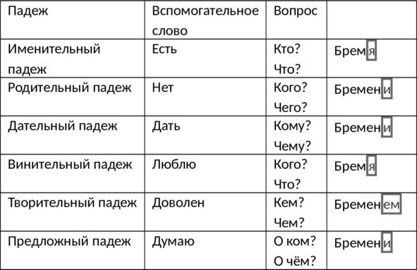 Десять существительных среднего рода на -мя (бремя, время, вымя, знамя, имя, пламя, племя, семя, стремя, темя) в родительном, дательном и предложном падежах в единственном числе имеют окончания существительных 3-го склонения -и: к знамени, от времени, в пламени, в имени, о племени и т.д., а в творительном падеже принимают окончания существительных 2-го склонения: -ем (-ём): над знаменем.