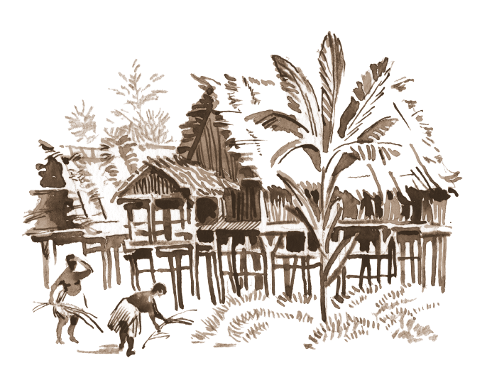 Родное селение Элеле Когхе раскинулось на небольшой возвышенности посреди плоскогорья. Несколько домов, построенных на высоких сваях, вбитых в землю, стояли двумя параллельными рядами, образуя довольно широкую улицу, покрытую хорошо утрамбованной красной глиной. В конце улицы, на краю обрыва, стояло сооружение покрупнее, которое туземцы называли «эмоне». В эмоне происходили собрания старейшин, жили вожди и неженатые члены племени. Жилые дома были оборудованы со стороны улицы небольшими галереями, прикрытыми слегка изогнутыми кверху крышами. Селение было защищено полукругом частокола из заостренных бревен. Это укрепление свидетельствовало о воинственности таваде, которые, ведя непрерывную войну с соседями, опасались их возможного нападения.