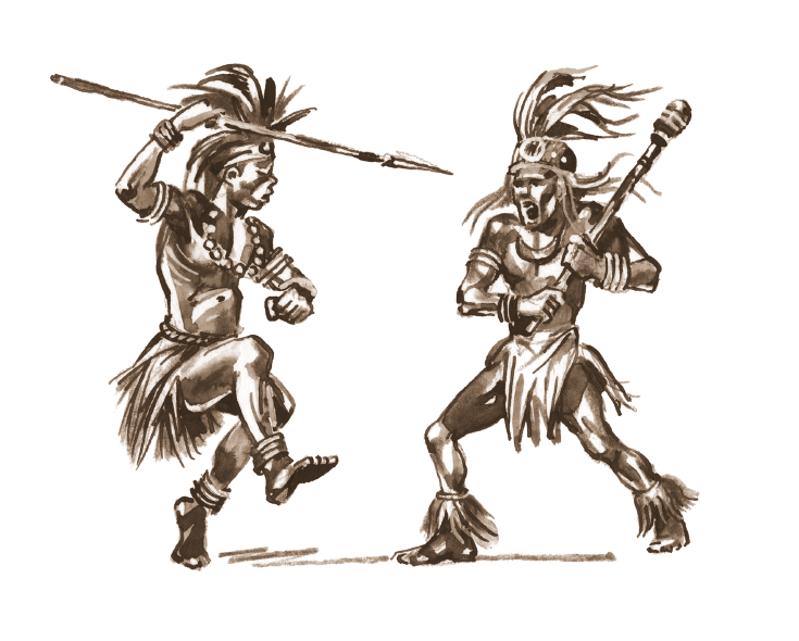 В полном вооружении воины разделились на две группы, которые встали лицом к лицу в длинные ряды. Сначала воины обоих отрядов бросали друг на друга грозные взгляды, напевая вполголоса устрашающую песнь. Потом танцоры начали потрясать копьями, луками и каменными палицами. Стоя на месте, они мерно и крепко били ногами по земле, так что облако красноватой уличной пыли полностью заволокло их ряды. Темп танца постепенно убыстрялся. Обе группы танцоров делали один шаг вперед, потом отступали на два шага назад, поворачивались раз направо, раз налево и внезапно бросались вперед, издавая боевой клич. Они долго то наступали друг на друга, то отступали назад, пока наконец в воздухе не раздался свист стрел, пущенных из луков.