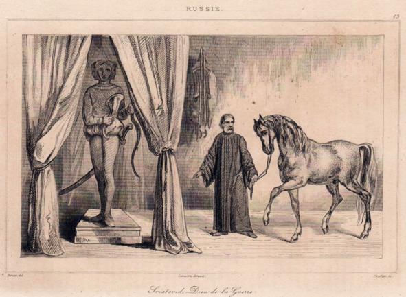 В томе, посвященном России, между 73 и 74 страницами, я нашел очень интересную иллюстрацию славянского бога Святовита и человека, который преподносит ему в дар коня[2].