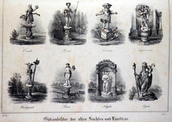А, как вам такое изображение германских (славянских?) богов из книги «Saxonia. Museum für Sächsische Vaterlandskunde. Erster Band» (Саксония. Музей саксонского отечества. Первый том в 24 выпусках с 74 литографированными приложениями, выпуски 1–24 (май 1834 г. — апрель 1835 г.). В одном томе.) на 72 странице[5]?