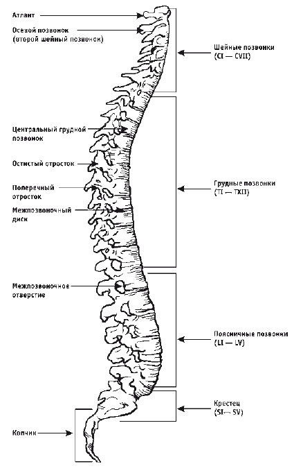 В шейном отделе насчитывается 7 позвонков (в медицине их принято обозначать CI–CVII), в грудном – 12 (TI– TXII), в поясничном – 5 (LI–LV), в крестцовом – 5 позвонков (SI-SV), сросшихся воедино (рис. 1). Кроме того, в копчике также есть от 3 до 5 маленьких позвонков.
