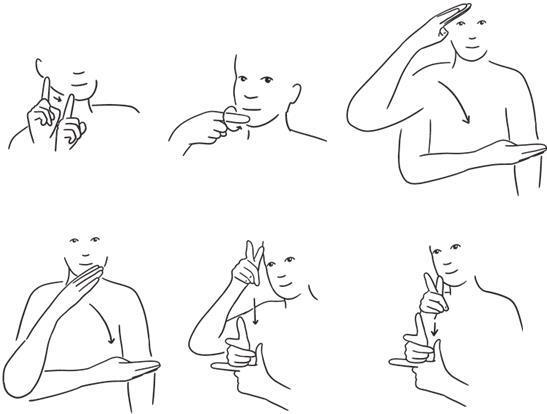 Имя: дважды стукнуть сомкнутыми указательным и средним пальцами одной руки по указательному и среднему пальцу второй.