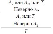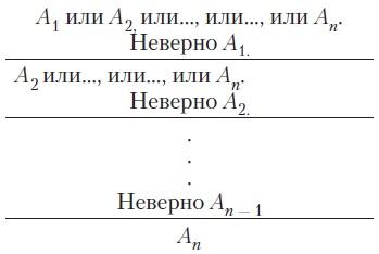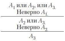 Пример. В закрытом помещении находились три человека, и один из них оказался убит. Точно установлено, что в помещение никто не входил и никто из него не выходил. Рассуждать можно так. Установлено, что имеет место именно убийство, а не самоубийство, т. е. умерший человек не убивал (самого себя) — неверно A1, второй не убивал — неверно A2. Следовательно, третий человек совершил убийство — А3. Схематически: