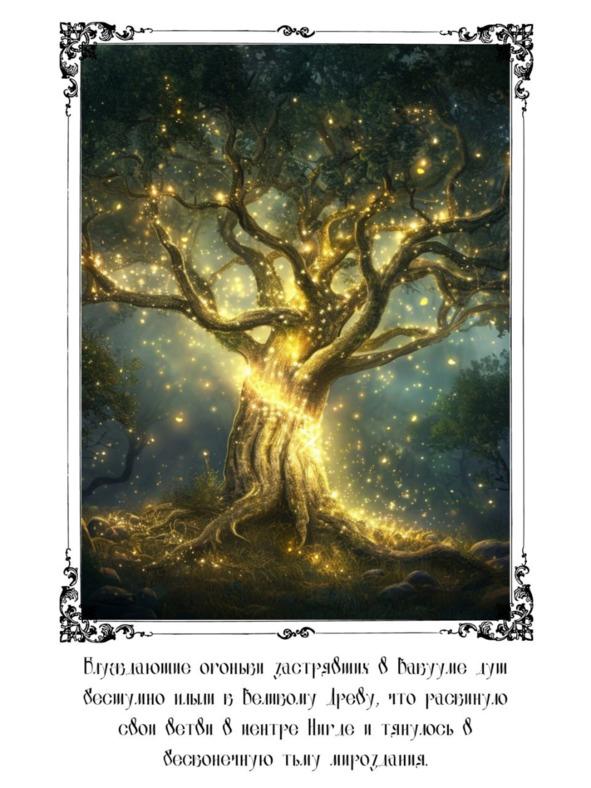 В Нигде не существовало ни дня, ни ночи, но вселенский мрак навис над городом плотной пеленой тумана. Там, за дверьми Заведения, по мощеным улочкам ползли тени, призраки задували свечи в фонарях, и зловещие силуэты таяли и переплетались в танце невидимых нитей. Блуждающие огоньки застрявших в Вакууме душ бесшумно плыли к Великому Древу, что раскинуло свои ветви в центре Нигде и тянулось в бесконечную тьму мироздания, сплетая собой неисчислимое множество затерявшихся в Пустоте островков-городков Межмирья, блуждающих средь Черных вод.