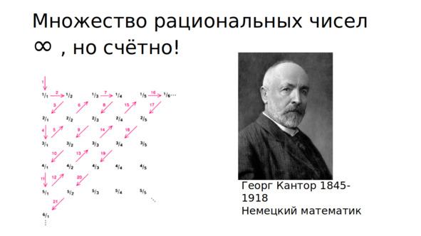 Интересно заметить, что целые числа можно сосчитать, а именно: сопоставить каждому целому числу натуральное число — его модуль. Отрицательные числа можно считать парами вместе с положительными (это напоминает работу проводника на два вагона). Такое множество, хотя и бесконечно, является счётным. Несложные рассуждения позволяют сделать вывод, что является счётным множество рациональных числе p/q. Представим себе огромный (бесконечный) кинозал, где номер ряда — это числитель, а номер места — знаменатель. Так например в первом ряду расположены слева направо (или с Запада на Восток) зрительские места с дробями 1/1, 1/2, 1/3, 1/4 и т. д. Во втором — 2/1, 2/2, 2/3, 2/4 и т. д. Предположим, что все места размещены в зале с соблюдением социальной дистанции, так что контролёр может свободно перемещаться как по рядам, так насквозь любого ряда.