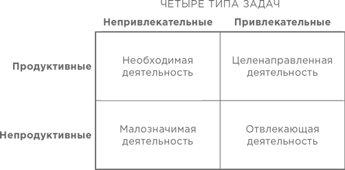 Чтобы разделить вещи, на которых нам нужно концентрироваться, на категории, необходимо ориентироваться на два основных критерия: продуктивна ли задача (то есть многого ли вы достигнете, выполнив ее) и привлекательна ли она (ею интересно заниматься) или нет (она скучная, трудная, угнетающая и т.п.).