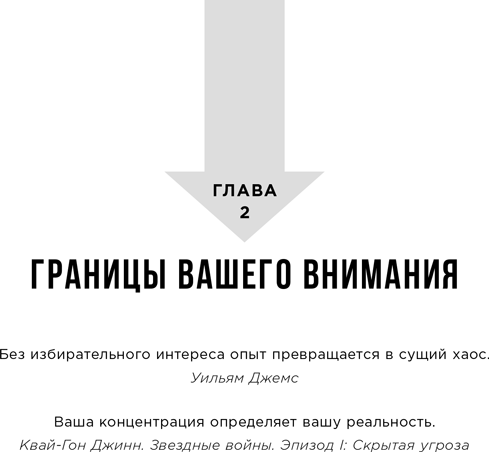 Решить, куда направить внимание, — значит тоже оказаться на таком распутье. Разные дороги ведут к многочисленным целям, на которых можно сосредоточиться. Прямо сейчас вы поглощены этой книгой. Но если оторвете глаза от бумажной страницы или электронной книги, то вы увидите много вариантов, и некоторые из них значимее и продуктивнее остальных. Сосредоточиться на этой книге, возможно, продуктивнее, чем сосредоточиться на смартфоне, стене или фоновой музыке. Когда вы вместе с другом завтракаете в кафе, то получите больше удовольствия, уделяя все внимание ему, а не экрану телевизора в кафе, на котором показывают футбольный матч.