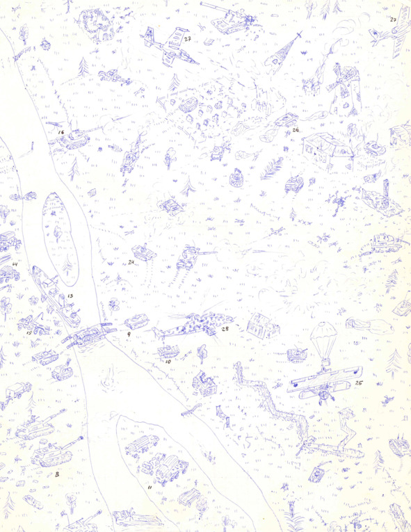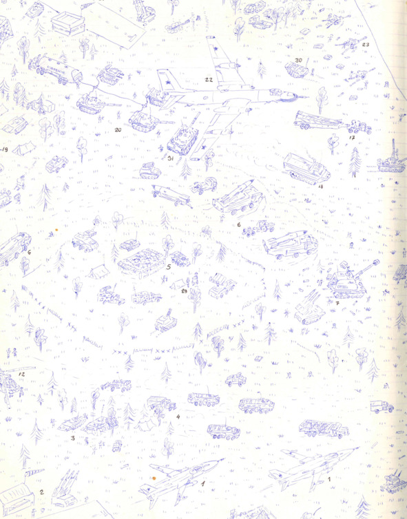 Цифрами были обозначены и многие другие боевые единицы с российской стороны: танки, бронетранспортёры, самолёты, катер, штабной блиндаж и даже отдельные человечки. За цифрами скрывались однокурсники — друзья и приятели Володи. Генералов на карте было немного — кроме Володи, ещё был его лучший друг, генерал-майор танковых войск Евгений Шуршалин, уже закрасивший почти все клеточки в своей сложной таблице.