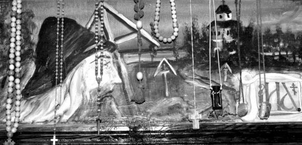 На фото роспись над дверью кабинета сделана поэтом весной 1984. На картине изображён монах-странник (слева), идущий в сторону дороги, которая проходит через кладбище пустынников (три креста) и ведёт к небольшому скиту. Терентий отказался более подробно комментировать эту картину. Удивительно, но изображение сохранилось, несмотря ни на какие ремонты. Перед росписью сегодня висят чётки, подаренные Травнику в те годы разными людьми. Всего их девять. На размещённом выше фото присутствуют первые пять из нижеприведённого списка (слева направо):