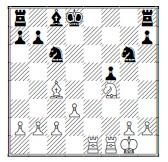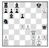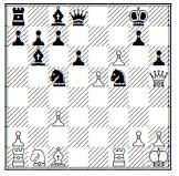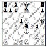 13. С:h6+ Л:h6 14. Лf7+ Крg6 15. Фd3! Сf6. Единственный ход, обеспечивающий черным возможность к отражению сильной атаки белых. 16. g3 Сf5 17. Лf1 Кb4 18. Фe3. Задуманная атака белых очень красива, но неверна. Впрочем, при отступлении ферзя на d1 продолжение могло бы быть 18…К:c3 19. bc d5.