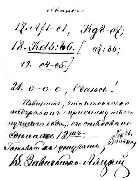 Письмо, в котором В. П. Завихойско-Ляцкий признает поражение в партии с А. А. Марковым