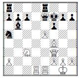 19. Кe8! Крh8. Нельзя 19…К:c4 из-за 20. Л:g7+ Крh8 21. Кf6! Сf5 22. К:h5 К:d2 23. С:d2 с выигрышем. 20. К:g7 Ф:h4 21. Ф:a5 Кc6 22. Кf5 К:a5 23. Лf8+ Крh7 24. Сg8+ Крg6 25. К:h4+ Крg7 26. Лe8 Кc6 27. d5 Сd7 28. Сd4+. Черные сдались.