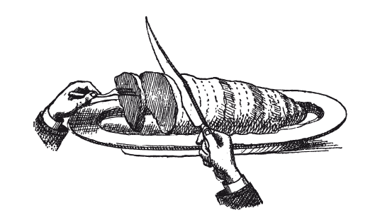 Разделение узкой и длинной рыбы (рис. 3). Надрезать рыбу рыбной лопаточкой или клинком ножа как раз посредине, вдоль, начиная ниже головы; другой надрез сделать по хребту, вокруг, затем разделить как брюшную, так и хребтовую часть на мелкие поперечные кусочки, снимая с костей ложечкой каждый кусочек; переворачивают затем рыбу на другой бок и проделывают то же самое. Тогда как хребтовая, так и все остальные кости останутся на блюде, где лежала цельная рыба.
