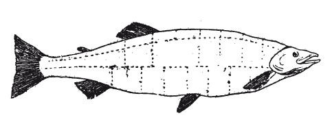 Для этого берут рыбную лопаточку (см. рис. 1), которая специально продается в посудных лавках, и надрезают ею рыбу как раз посредине, вдоль хребта, начиная немного ниже головы, и надрез этот ведут вплоть до хвоста. Получатся две половины: верхняя – хребтовая часть и нижняя – брюшная. Каждую из этих половин делят тоже лопаточкой на поперечные кусочки (рис. 2).