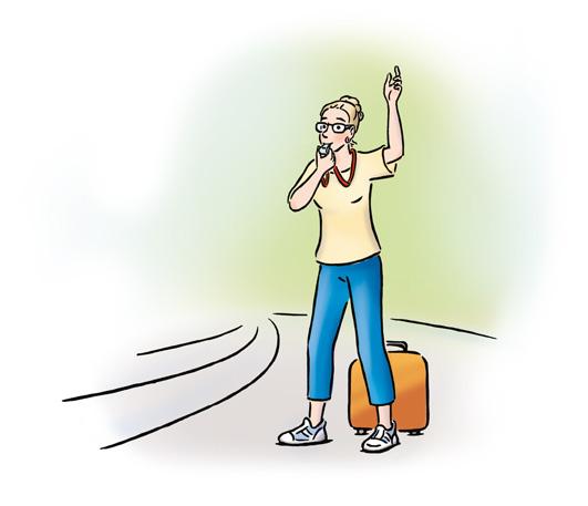 Внезапно раздаётся громкий свист. Работник вокзала удивлённо оглядывается по сторонам: обычно здесь свистит только он! Но свистевшую девушку это, похоже, не особенно волнует, потому что она снова дует в свой сигнальный свисток.